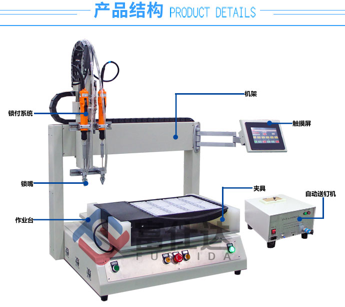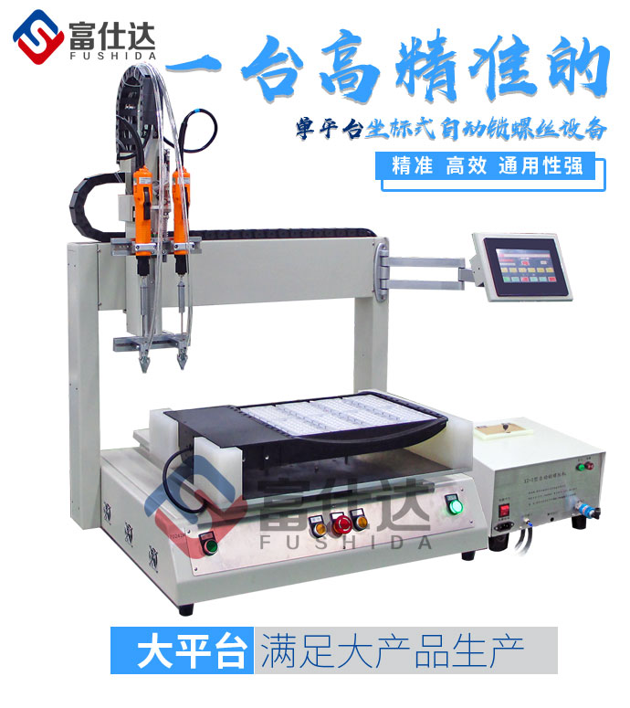 富仕達(dá)單平臺(tái)自動(dòng)鎖螺絲機(jī)是指單平臺(tái)坐標(biāo)式自動(dòng)鎖螺絲機(jī),通常用在面積較大產(chǎn)品,如:寫字板、大家電、天花吊頂、大型玩具及大型LED模組等。