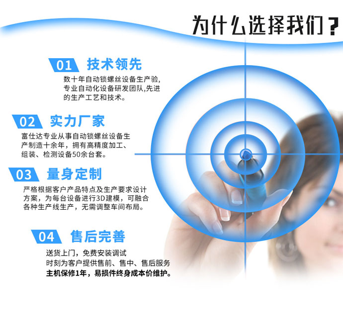 富仕達(dá)擁有獨(dú)立研發(fā)設(shè)計(jì)團(tuán)隊(duì),10多位自動(dòng)化高級(jí)工程師,5000㎡自動(dòng)鎖螺絲機(jī)生產(chǎn)、測(cè)試車間,專業(yè)售后服務(wù)團(tuán)隊(duì),為客戶提供方案設(shè)計(jì)、設(shè)備制造、操作培訓(xùn)、售后服務(wù)等一站式服務(wù)。 公司將持續(xù)提升技術(shù)創(chuàng)新和產(chǎn)品服務(wù)方面的優(yōu)勢(shì),堅(jiān)持“專業(yè)、精工、服務(wù)”的企業(yè)理念,聚焦于自動(dòng)鎖螺絲設(shè)備生產(chǎn),通過系統(tǒng)的一站式解決方案,真正的幫助客戶提升效率、降低成本,提升客戶的核心競(jìng)爭(zhēng)力。
