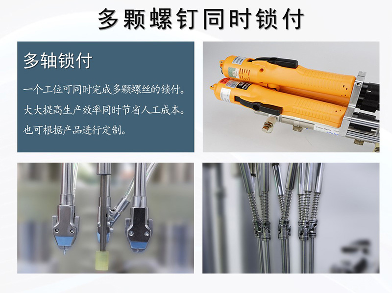 設備主要由自動送釘機、多軸鎖付系統、多工位作業臺、機械手臂等機構組成,根據產品螺絲數量定制多軸鎖付系統及自動送釘數量,達到一次輸送并擰好所有螺絲的效果,大幅提升效率,簡化工序。